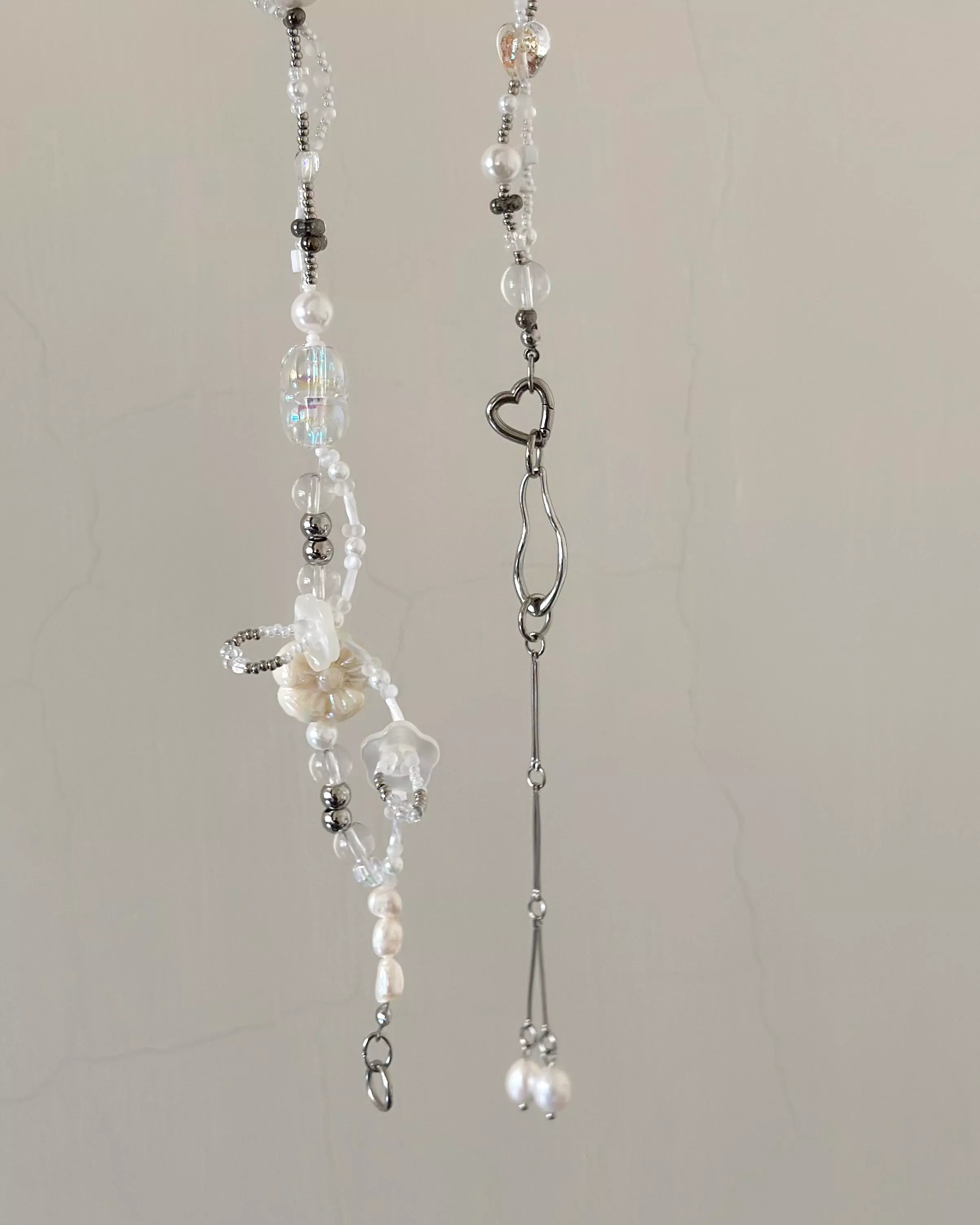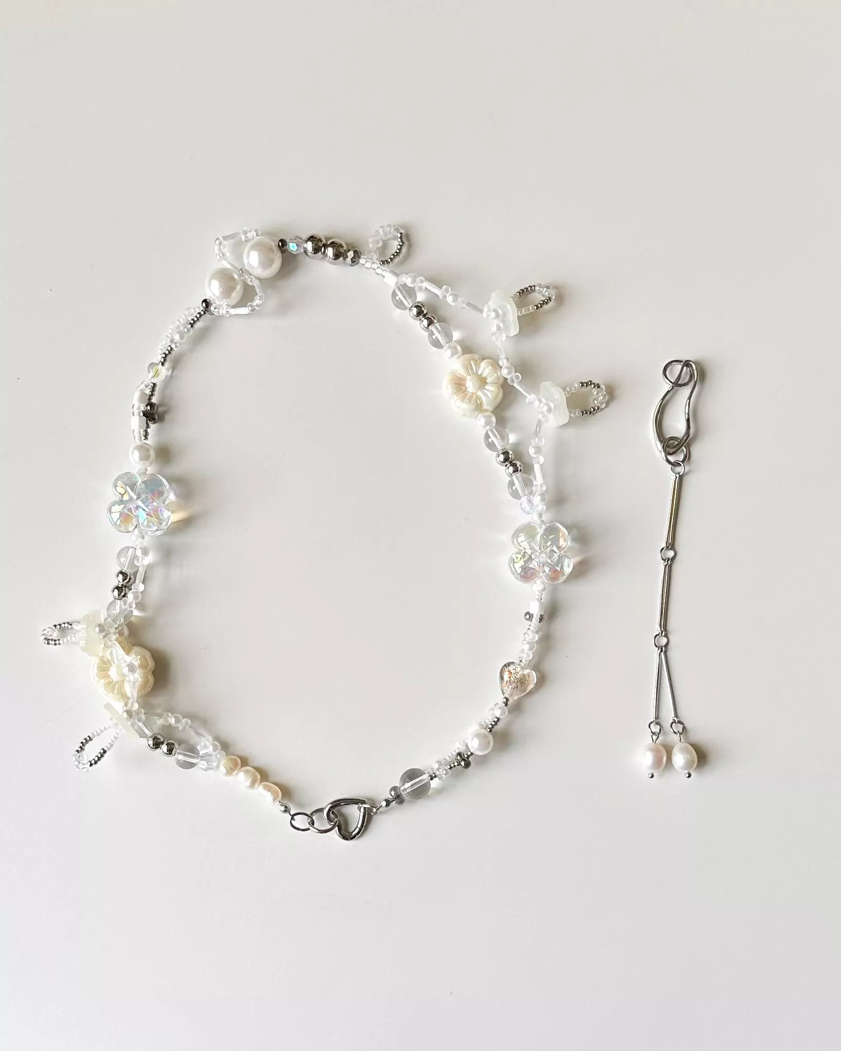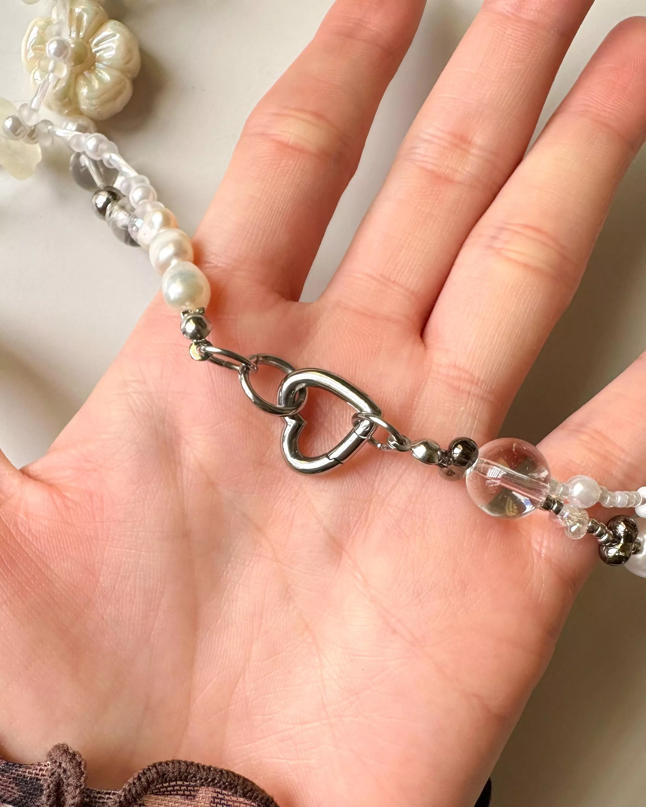 材料|醫療鋼(愛心彈簧扣+垂墜設計)、無彈力魚線、天然珍珠、琉璃造型珠、樹脂鈕扣、樹脂仿珍珠、壓克力透明珠、鋼珠、日本珠
