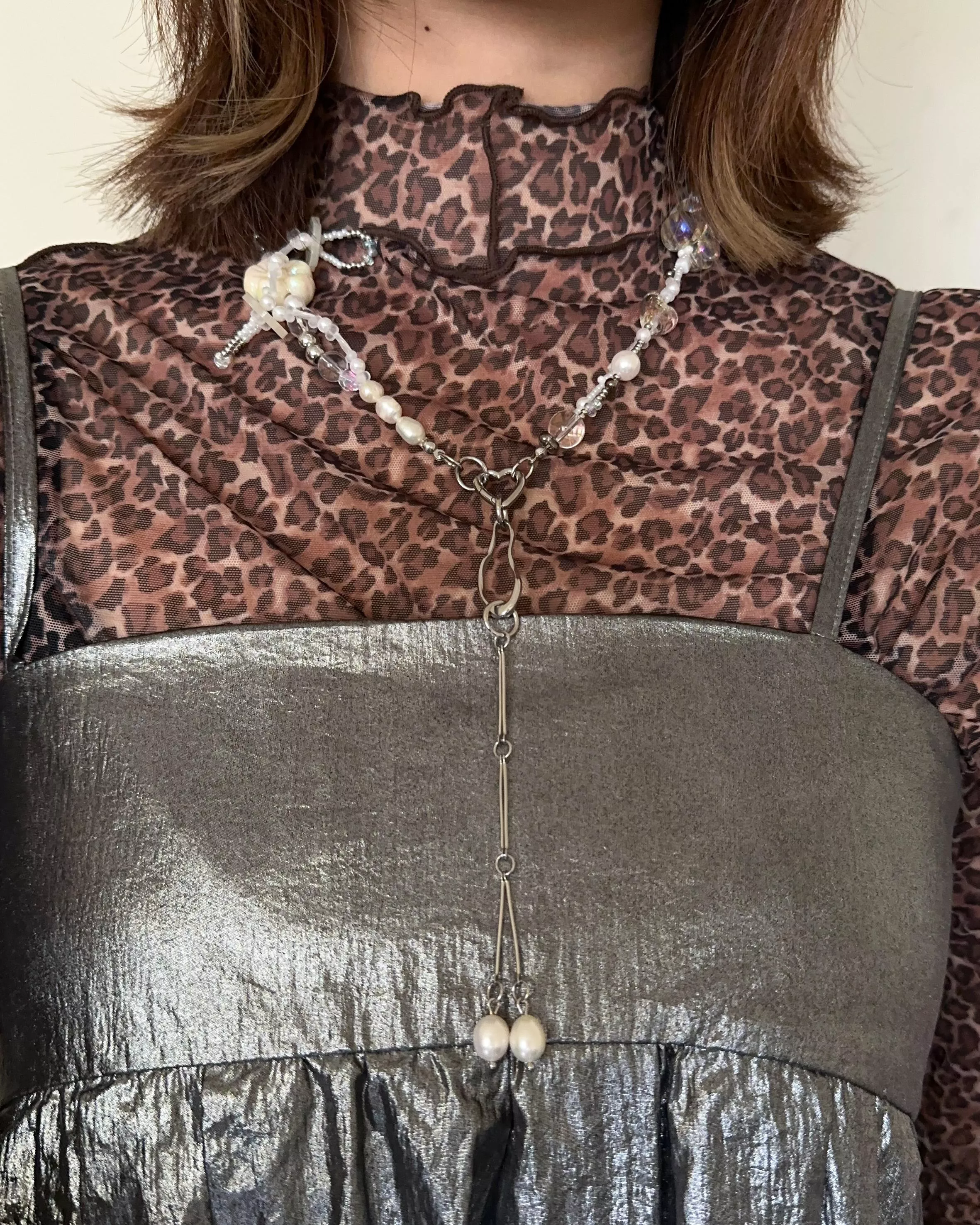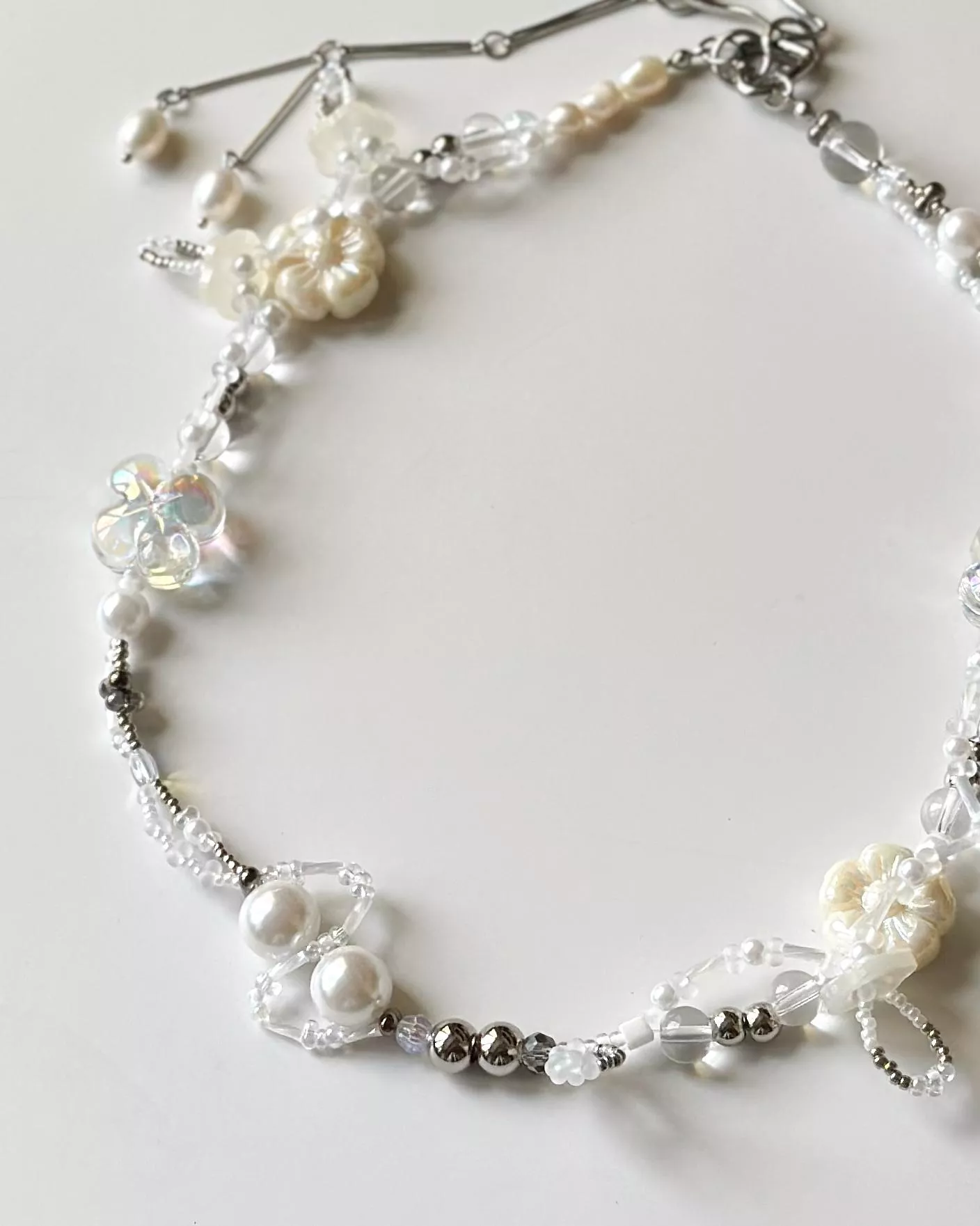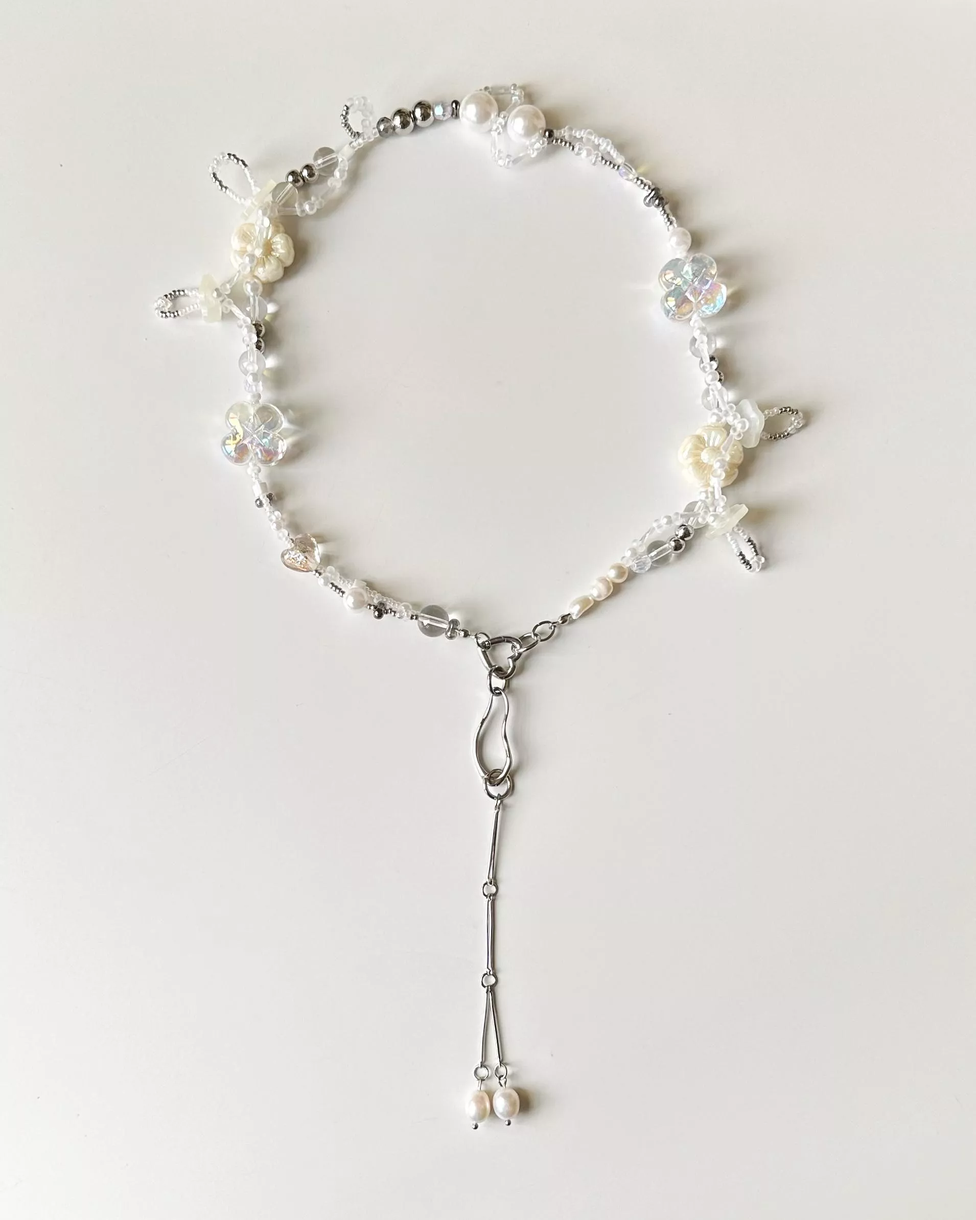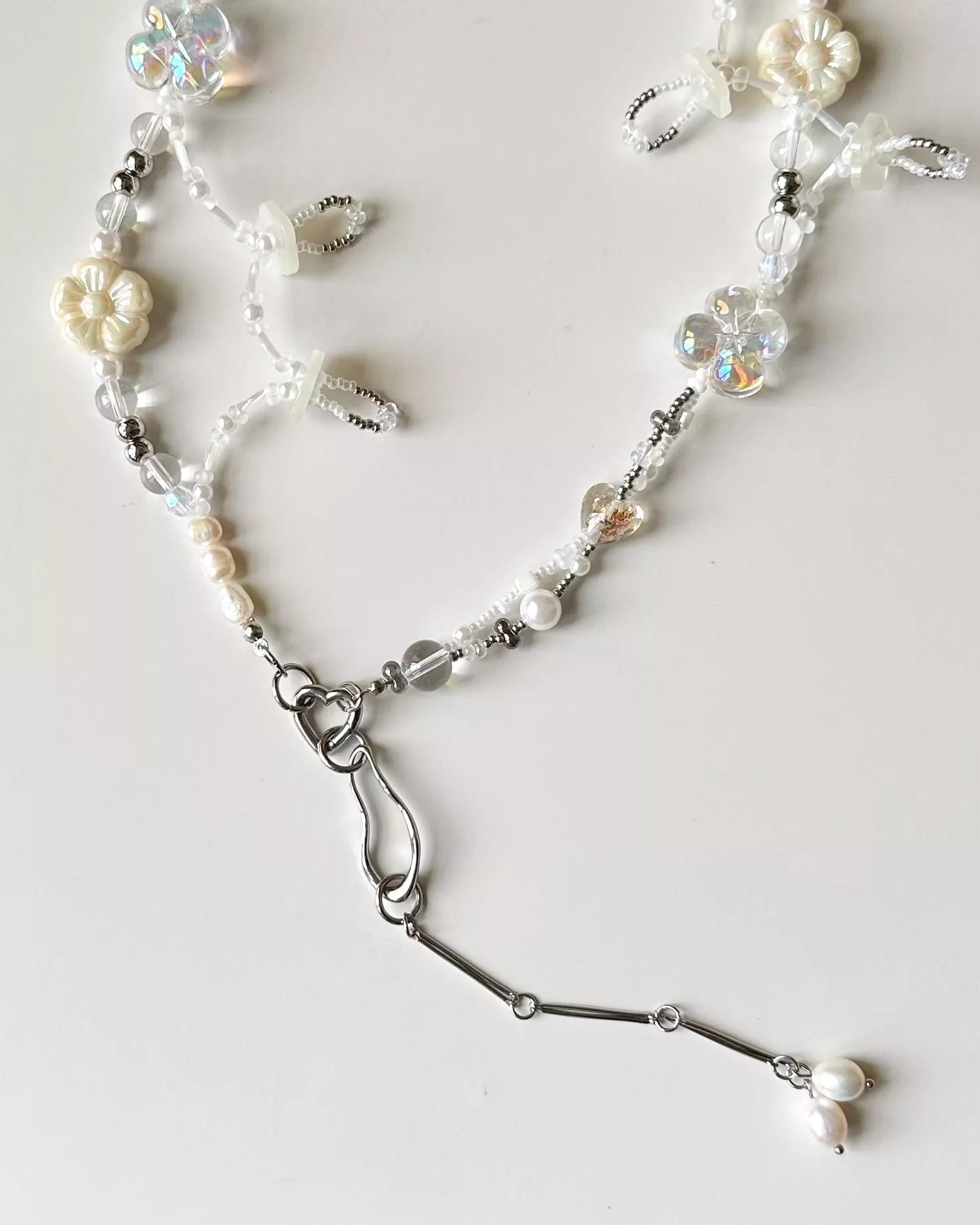 材料|醫療鋼(愛心彈簧扣+垂墜設計)、無彈力魚線、天然珍珠、琉璃造型珠、樹脂鈕扣、樹脂仿珍珠、壓克力透明珠、鋼珠、日本珠